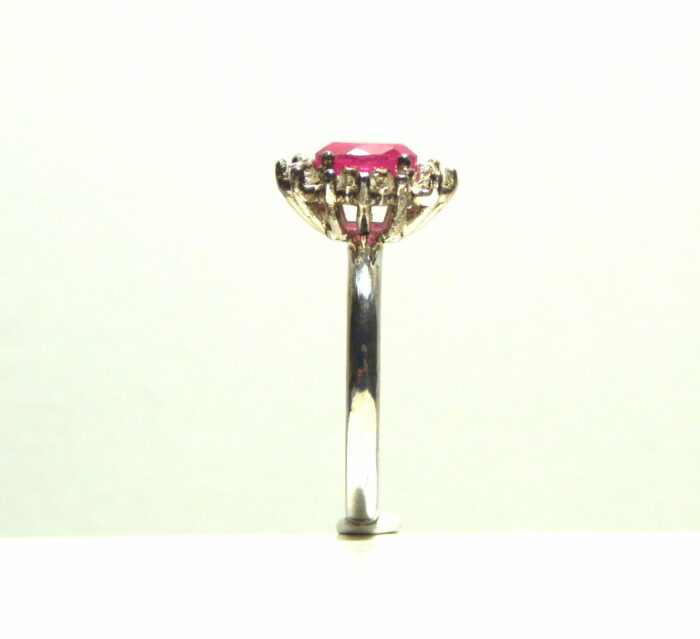 Nuestro anillo de compromiso está compuesto por una piedra preciosa central -zafiro, esmeralda o rubí- de 6 x 4 mm y la opción de añadir una orla de 12 circonitas o bien de 12 diamantes por un total de 0,13 ct. Es una elección original y con mucha personalidad.